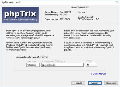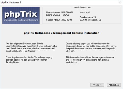 Beim ersten Aufruf unseres phpTrix NetAccess Tools "NACADMIN.EXE" wird automatisch die Installation gestartet.