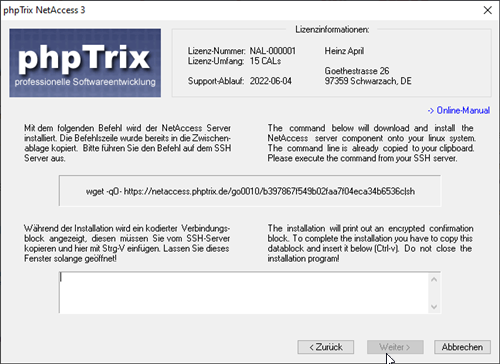 Auf dieser Seite müssen Sie später den verschlüsselten Verbindungsdatenblock aus der Serverinstallation eintragen. Lassen Sie dieses Fenster geöffnet während Sie die nachfolgenden Schritte durchführen.